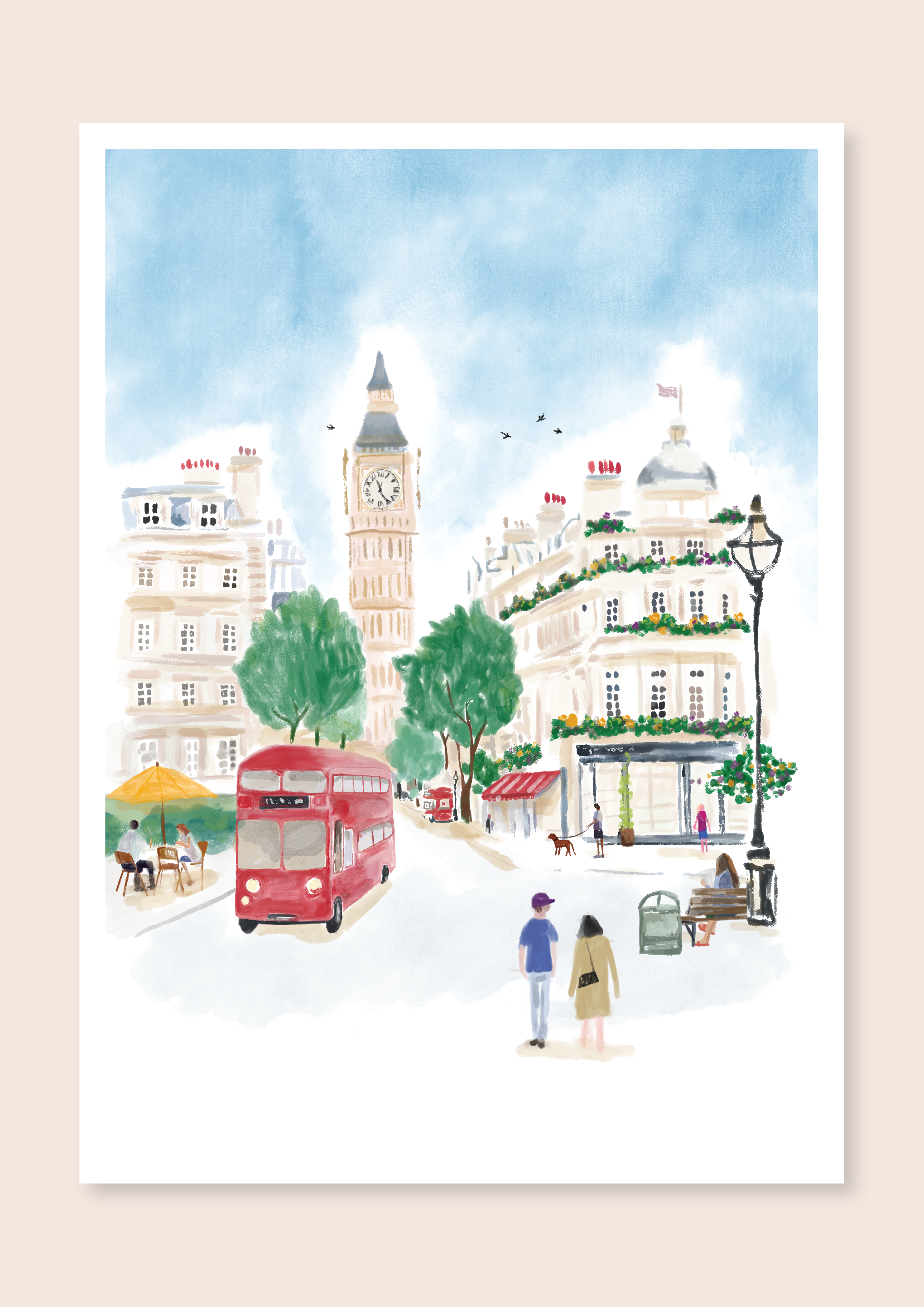 London Postcard Motif Illustration Custom illustrated summer London street scene postcard. Leanne Crook Creative Strategist2025